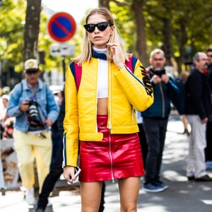 色彩鲜明的飘带在绿色大衣的映衬下街头感十足。